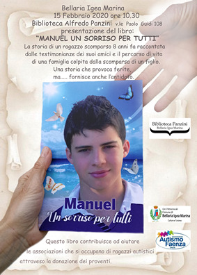 In occasione dell'VIII anniversario , è stato presentato il libro: Manuel un sorriso per tutti. La presentazione si è svolta all'aperto al circolo parrocchiale di Solarolo di fronte a centinaia e centinaia di persone. Manuel in questa occasione ha voluto fare le cose in grande e come al solito quando lui chiama, tutti rispondono: "Eccoci qua per te". Un ambiente surreale dove i più sensibili hanno raccontato di averne percepito la presenza. L'alternarsi di testimonianze con contenuti ricchi di suspance, di musiche da pelle d'oca e di letture di alcune pagine del libro, hanno coinvolto a tal punto i presenti che in tre ore non si è visto neanche un ragazzo abbandonarsi a guardare al cellulare. Si chiama: forma di rispetto nei confronti del loro Amico e di chi sta parlando. Grazie a tutti coloro che hanno voluto dedicare il loro tempo a questo evento, ma grazie soprattutto per la compostezza e il rispetto mantenuto durante tutta la serata.
